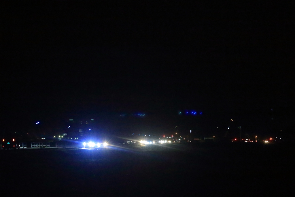 右手が救助隊。。ヘットライトは救助の為、左折禁止で渋滞の車の列。