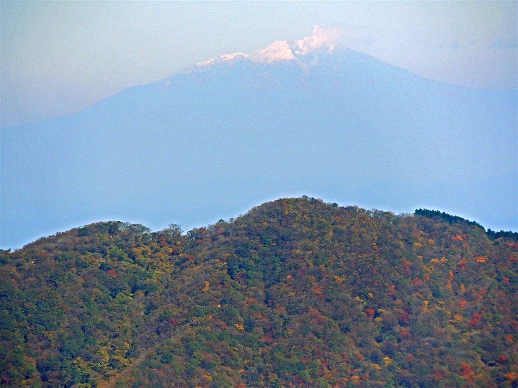 2 雲母峰の上に御嶽山 先週の鎌ヶ岳の時は雪なく、この日は雪化粧に噴煙