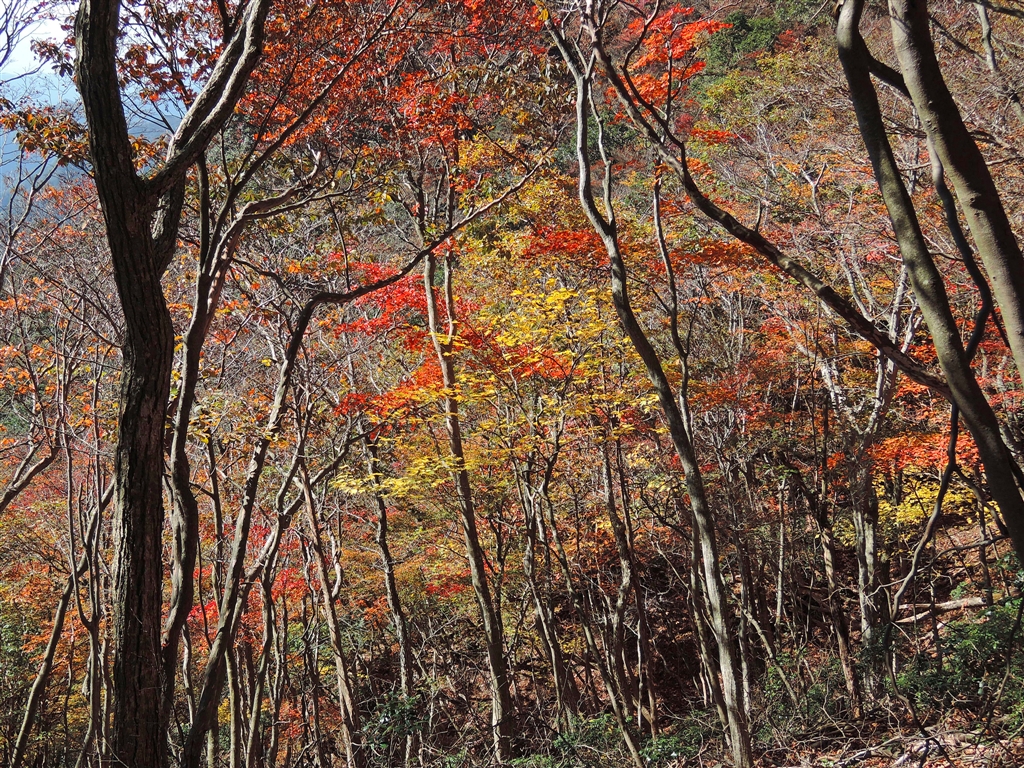 2 仙鶏尾根の南側はシロモジの黄とヤマモミジの赤の混合林が続きます。