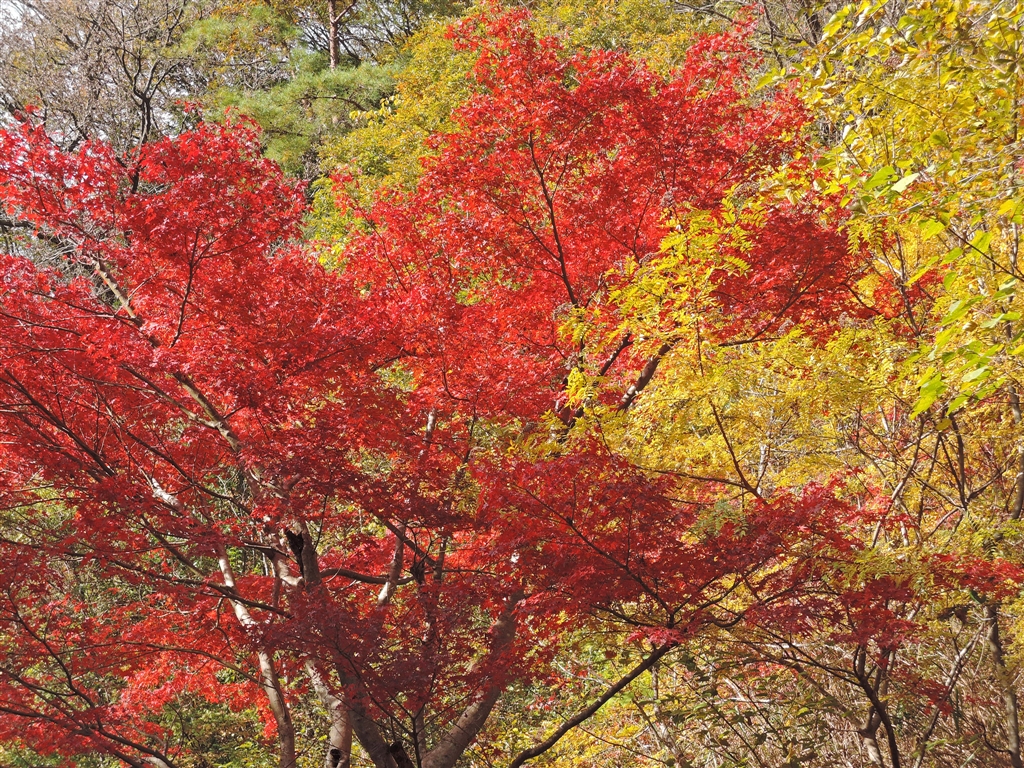 ヤマモミジの赤とアカシヤの黄