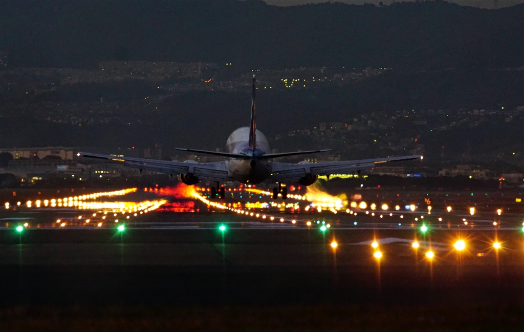 大阪空港。着陸灯が宝石のよう