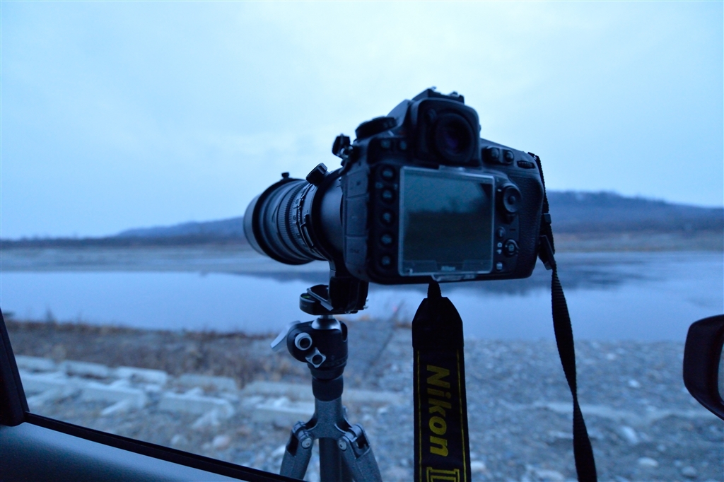 助手席の窓から三脚立てて54+D810を固定