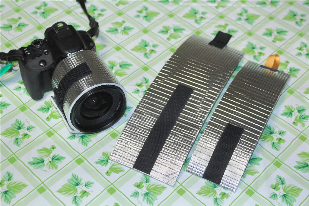 結露防止用のアルミ遮熱シート(使い捨てカイロを貼ったレンズの上から巻きつける)