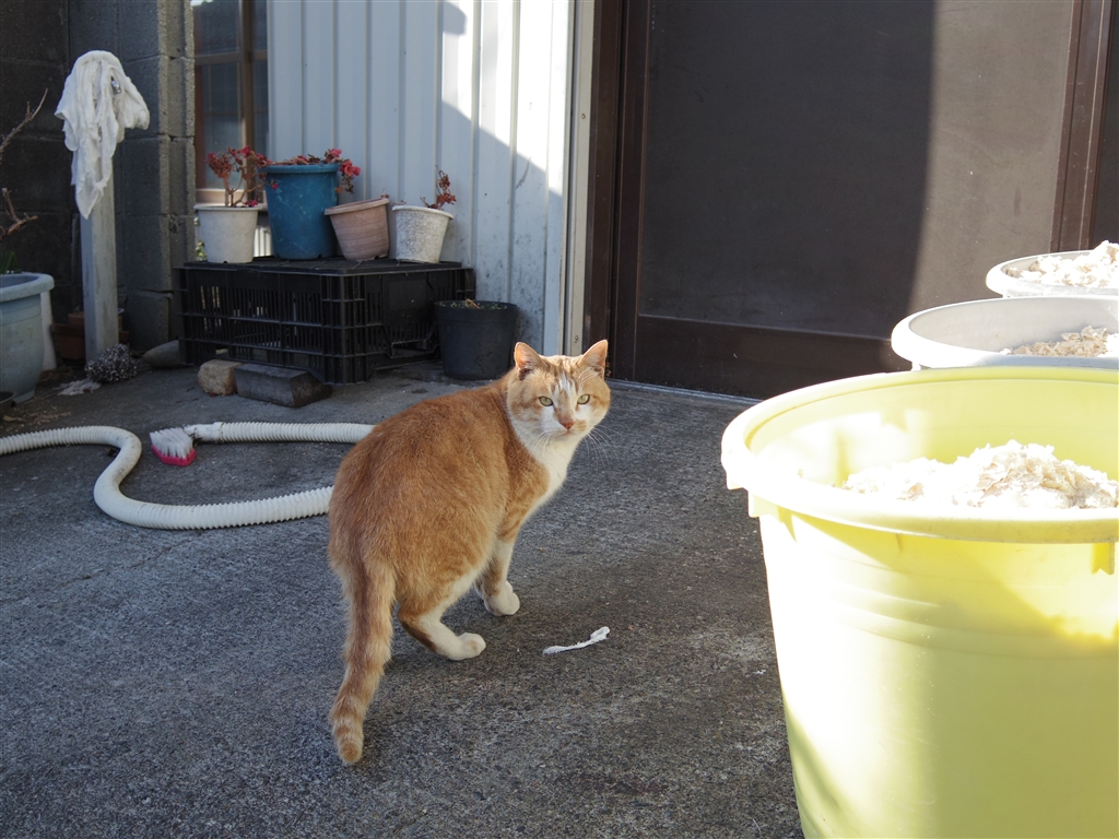 桶?の見張りをしているようでした。豆腐店の前なので、中身はおからかな?