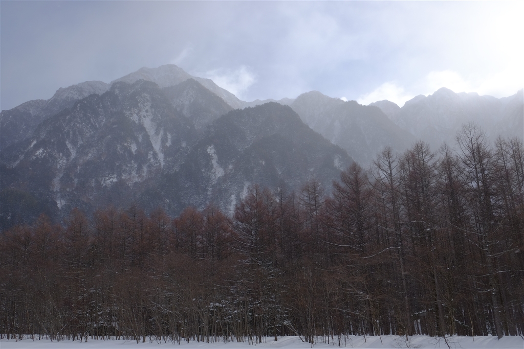 梓川右岸、明神が雪とガスで寒々しい