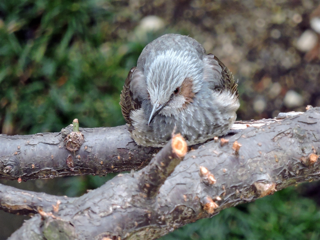 山道より見下ろせば、境内の木の枝にヒヨドリが寒そうに縮まっていたました。P600