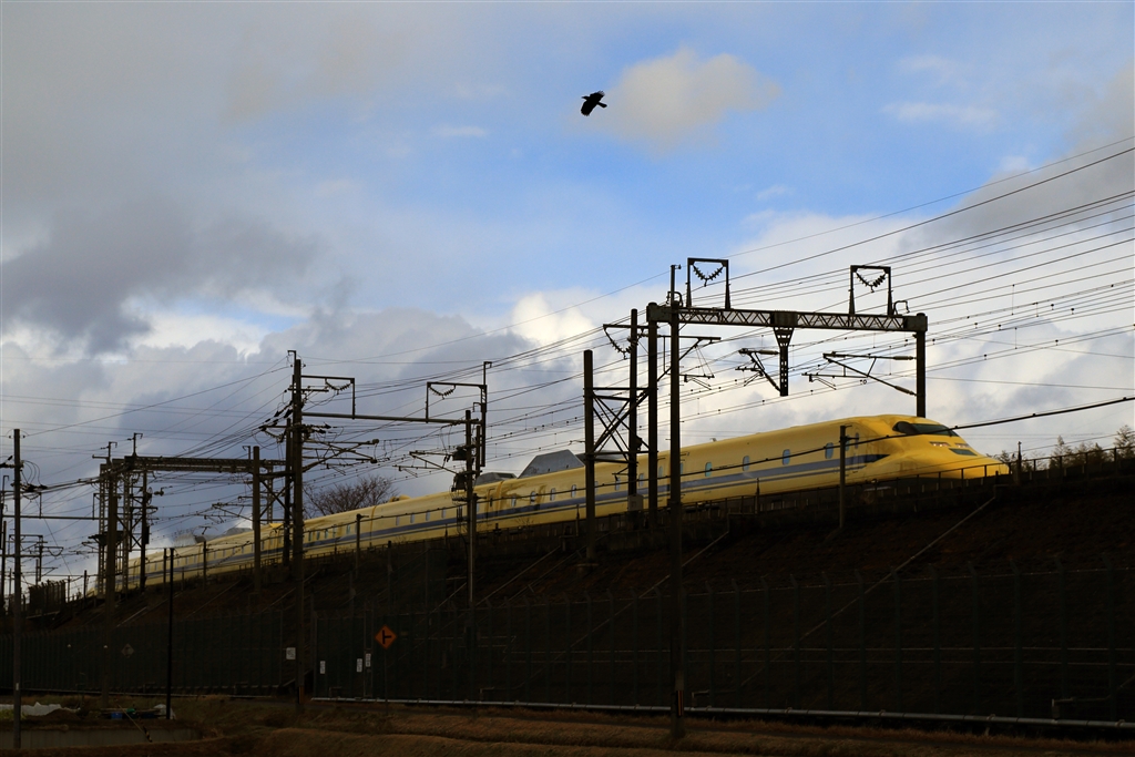 雪のドクターイエロー撮りたかったです「黄色と雪の白さ」、、下り