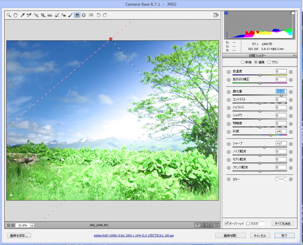 CameraRawの”段階フィルタ"に露出度を掛けました。