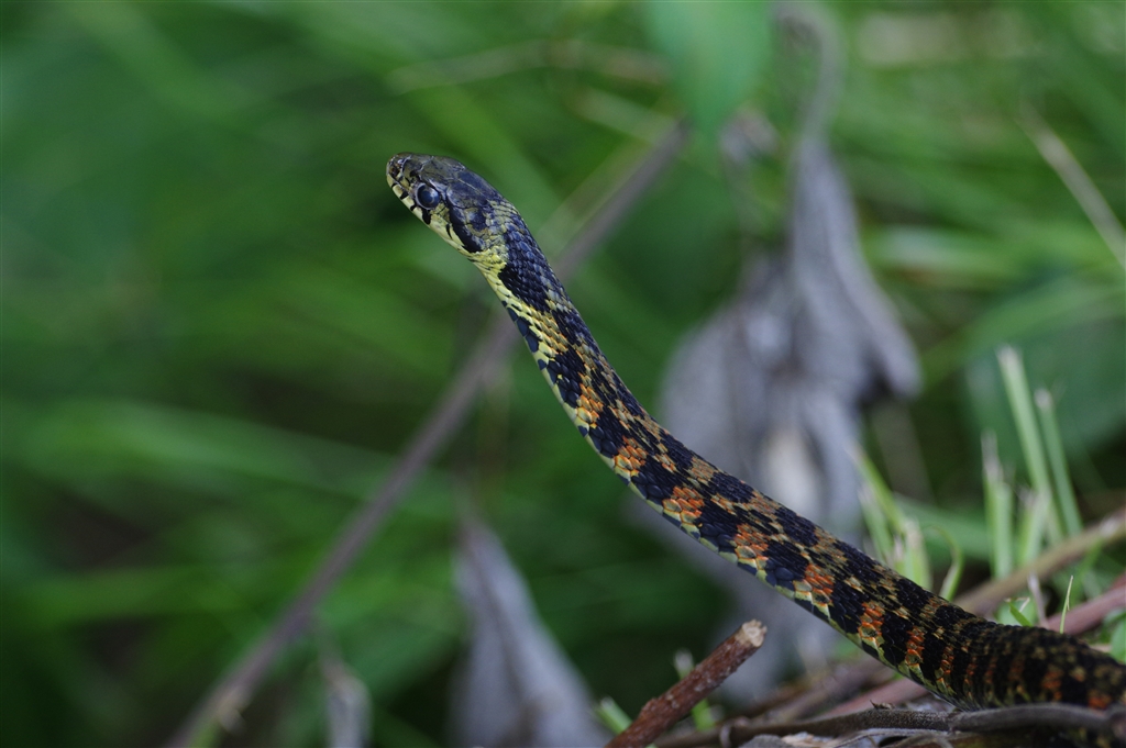 ヤマカガシ(畦から用水に首出してこちらを警戒中)