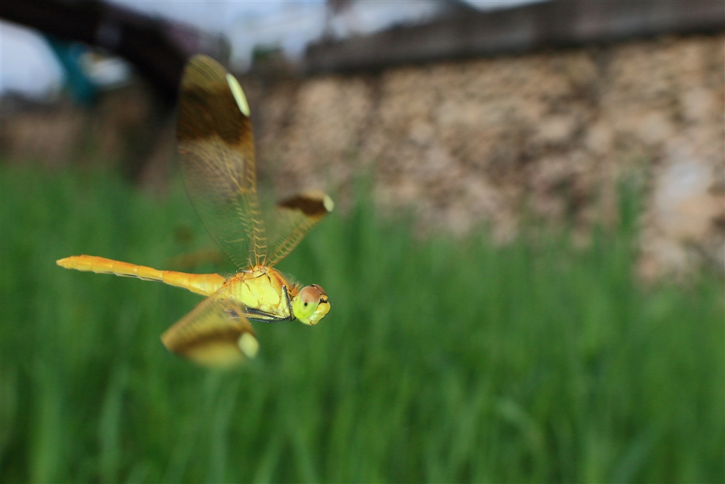 川原の草むらの低い処を飛ぶミヤマアカネ(婚姻色がまだ出ていない若い個体)