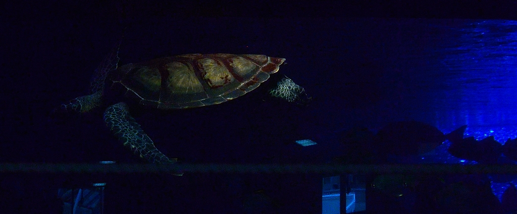 真っ暗な中撮影後トリミングしたウミガメ