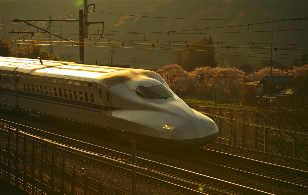 夕暮れ時の新幹線車両と桜
