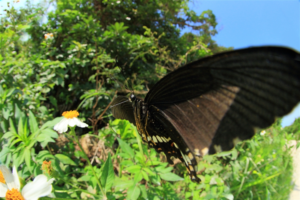 シロオビアゲハを無理やりフィッシュアイで撮った(四隅のケラレは画像処理で補った)