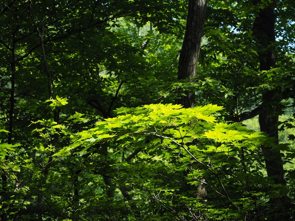 最近好きな新緑の逆光バージョン。ん、清々しくて気持ちい。森はいいなぁ。