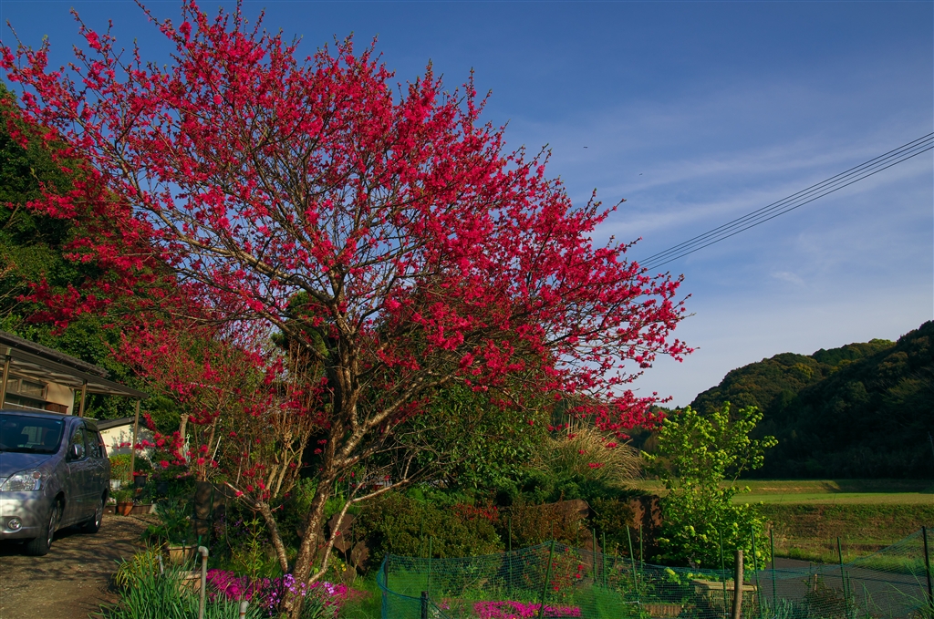 田園地帯のお宅の庭、モモの花だとおもいます