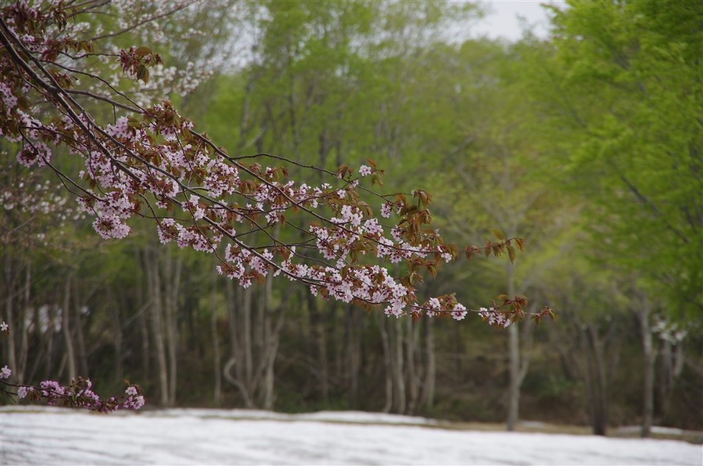 残雪をバックにオオヤマザクラ