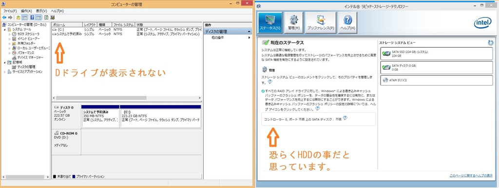 「コンピューターの管理」とIntel ラビット・ストレージ・テクノロジー