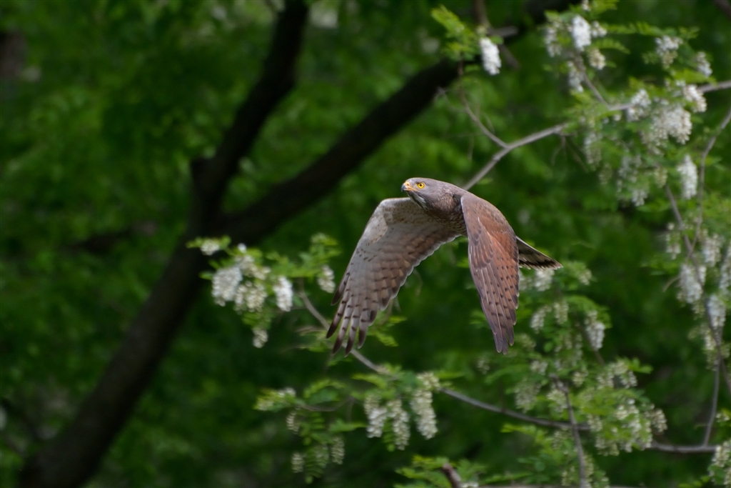 アカシアを背景に飛ぶサシバ ピン甘ですが・・・