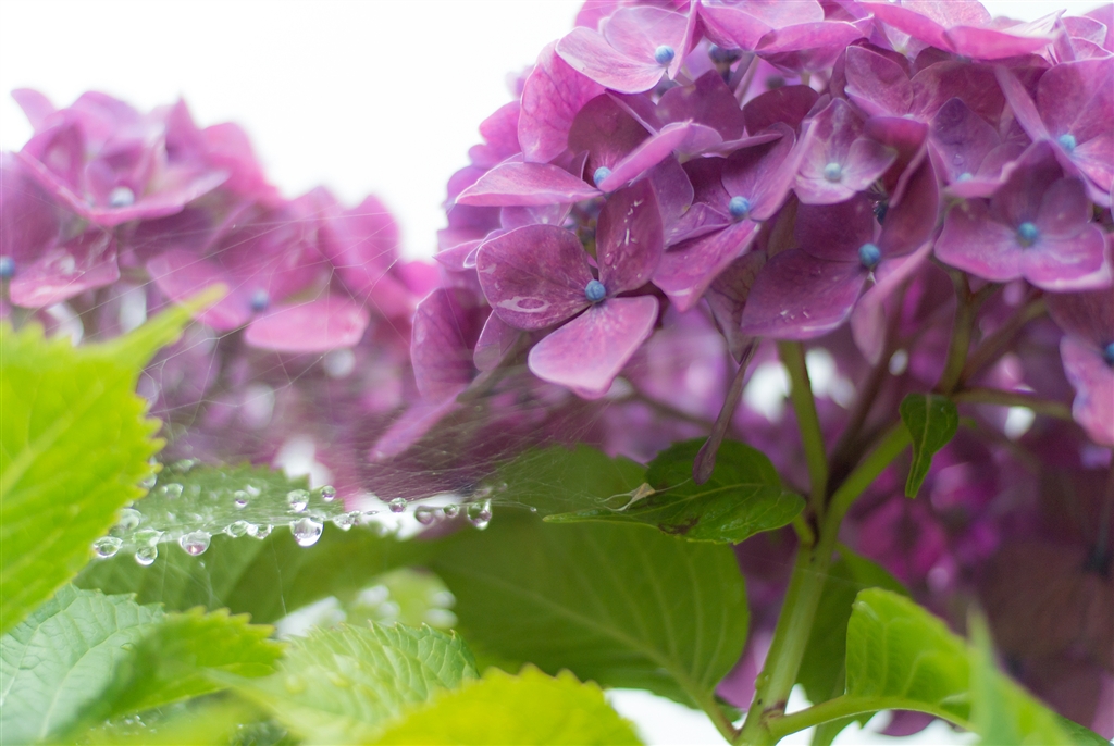 あじさい−2 あじさいと蜘蛛の糸にかかる雨滴 これをものにしたいけど