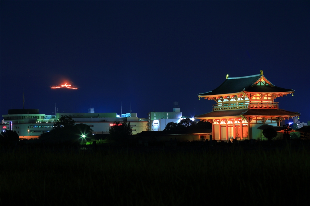 「平城宮跡・送り火」 朱雀門と大文字送り火