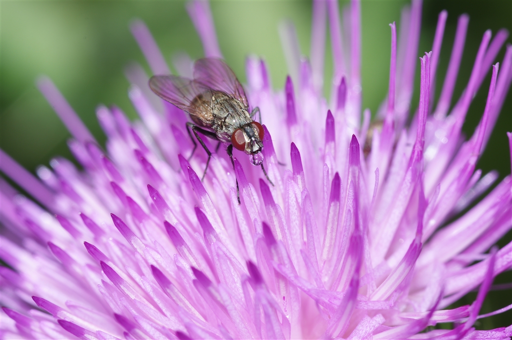 「くる禁」 アザミの上で水滴出すハエ 等倍