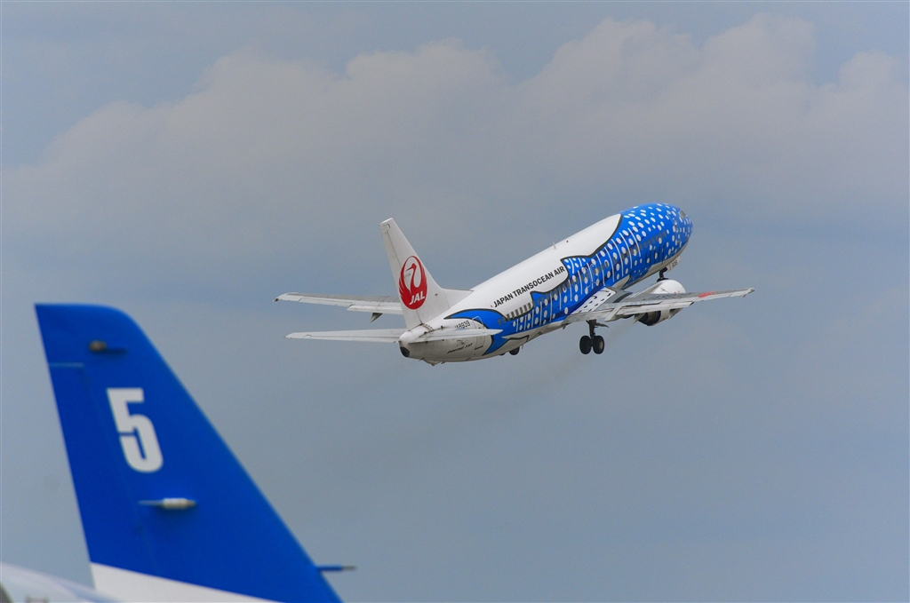 ブルーインパルスをかすめて離陸するジンベエザメ