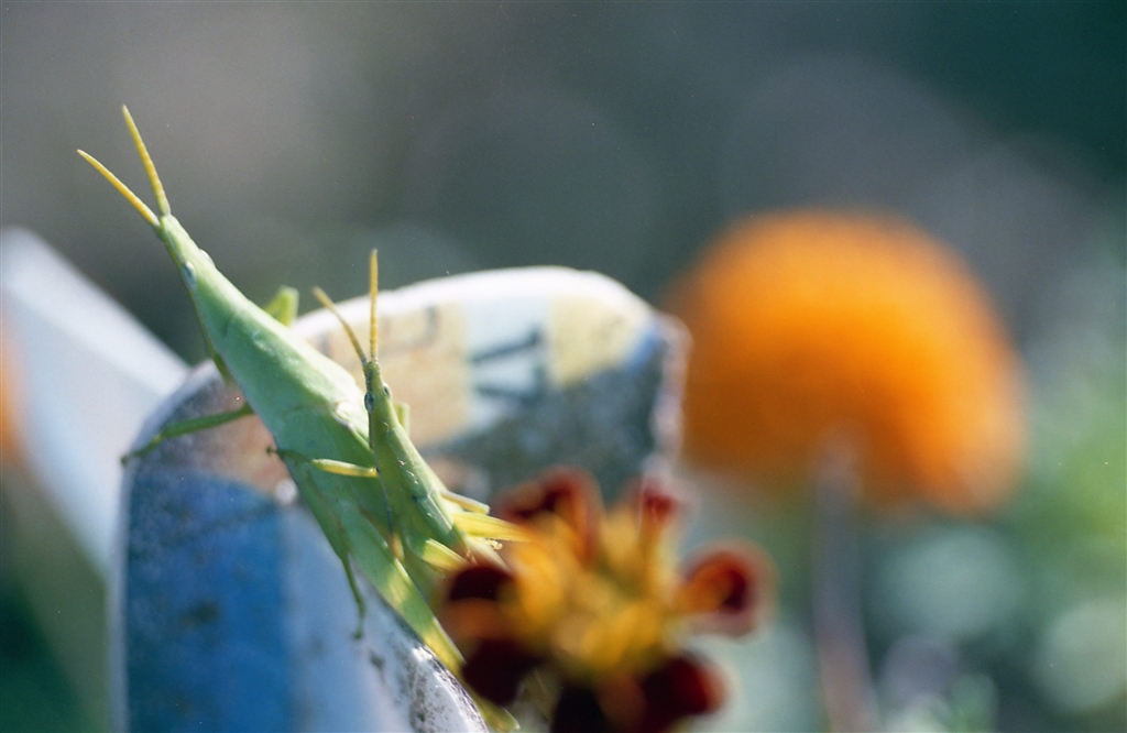 9月 不時着した飛行機の尾翼にしがみつくオンブ飛蝗 MX+FAマクロ100oF3.5 X-TRA400