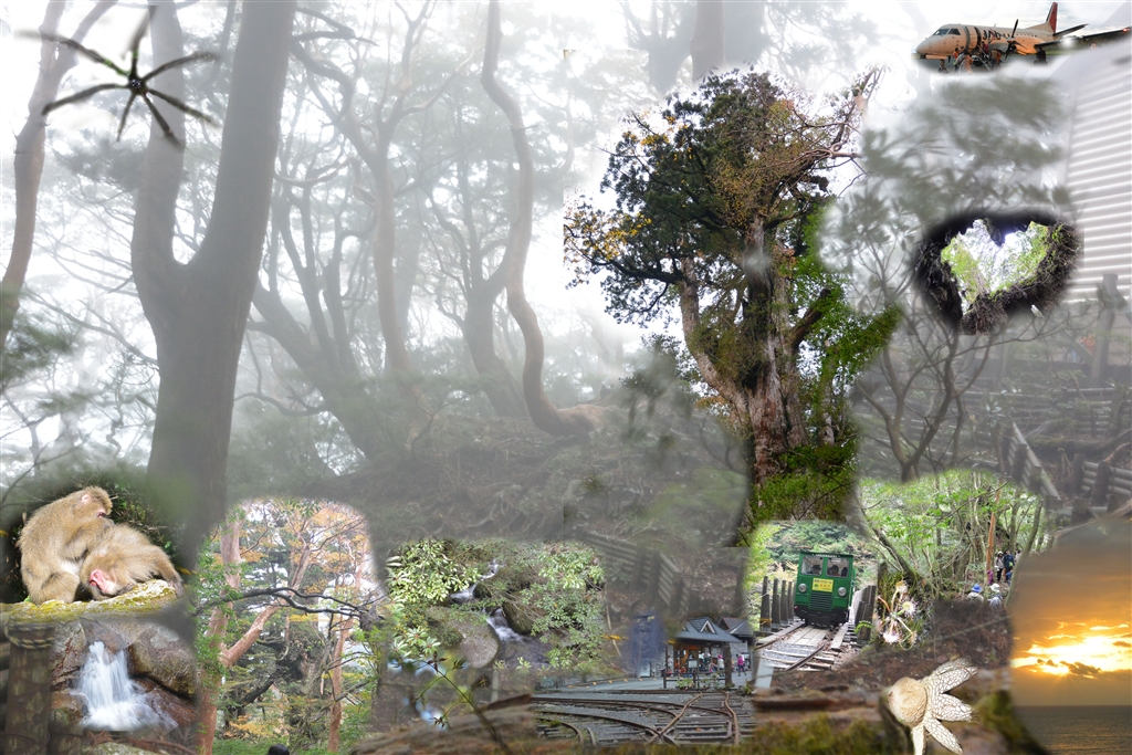 背景朝靄の縄文杉近キャンプ地