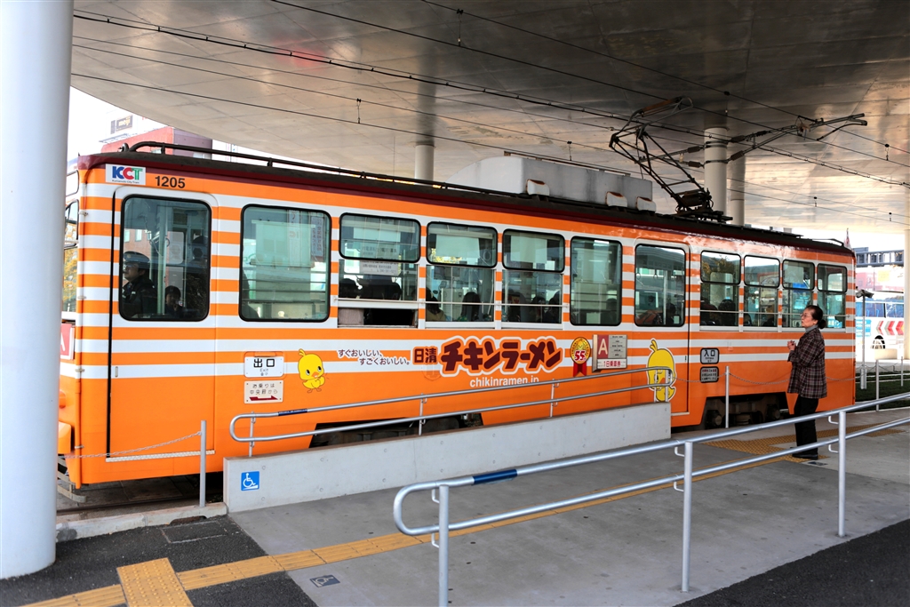 熊本駅前の熊本市電 チキンラーメン号