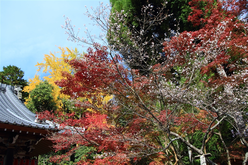 R(紅葉)G(葉)B(空)の他イチョウの黄色と季節外れの寒桜(白)が同居@赤山禅院