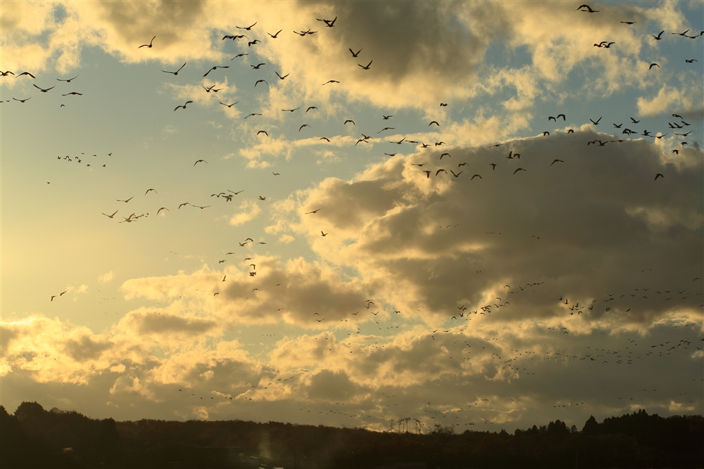 夕日の中、雁の群れ
