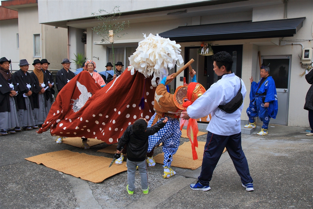「ささら」を鳴らす天狗に獅子が踊らされる(小さな子も真似してイナバウアー)