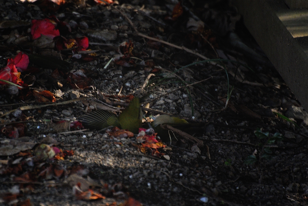 メジロが雌雄絡み合うシーンを撮っていたら、地面に激突。脳震盪?で起き上がれず。