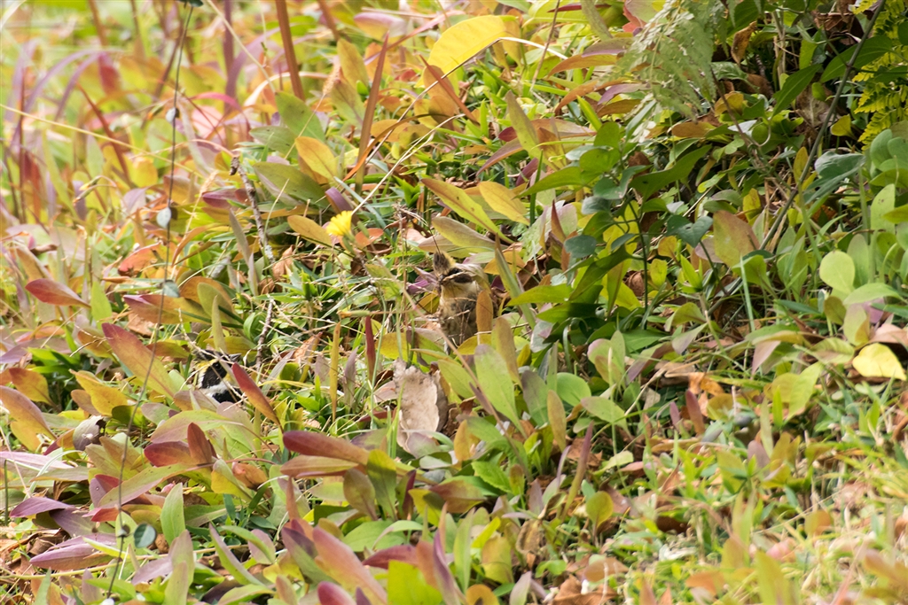 草むらに保護色の野鳥が2羽いるのが分かりますか??