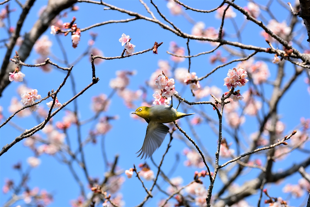 お終いに近づいた河津桜にて メジロの飛翔専門で