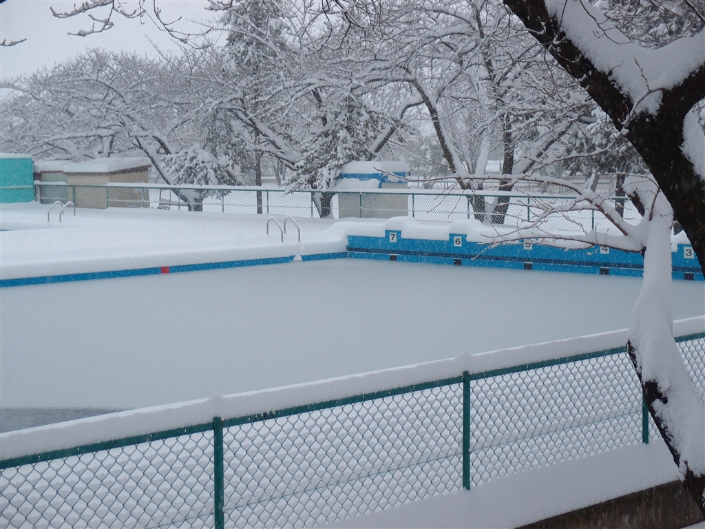 ラルゴさん、プールに雪降りました。