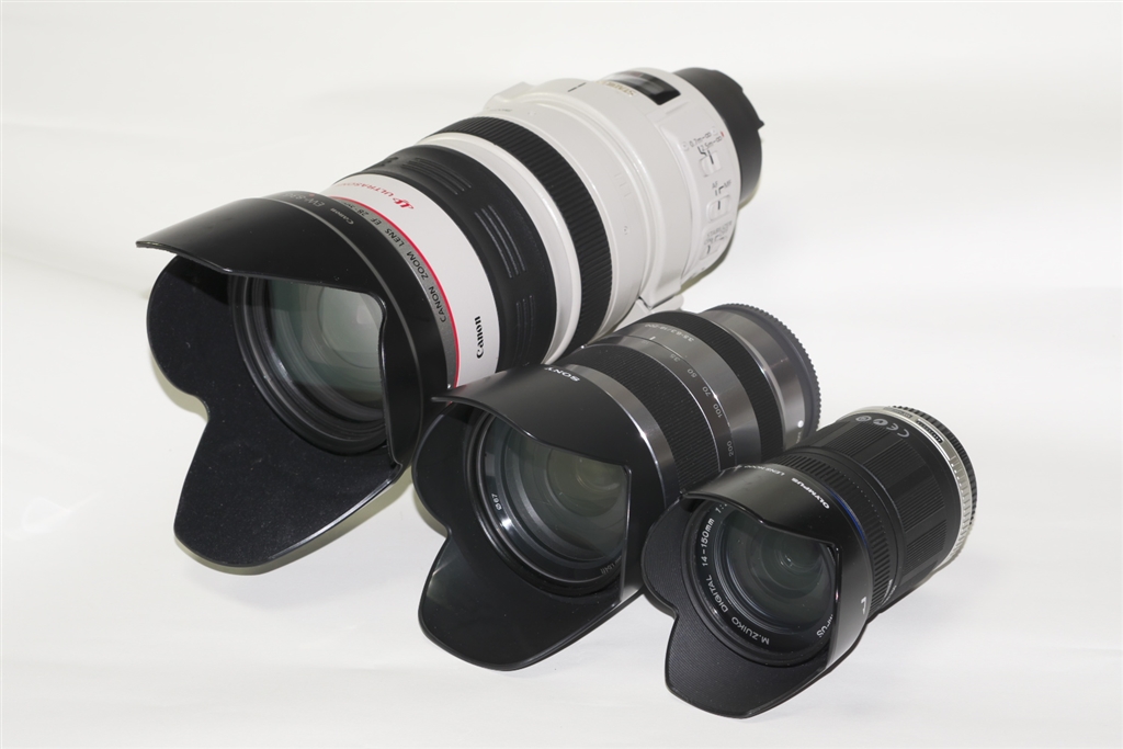 愛用のズボラズームレンズ、左から、キヤノン、ソニー、オリンパス