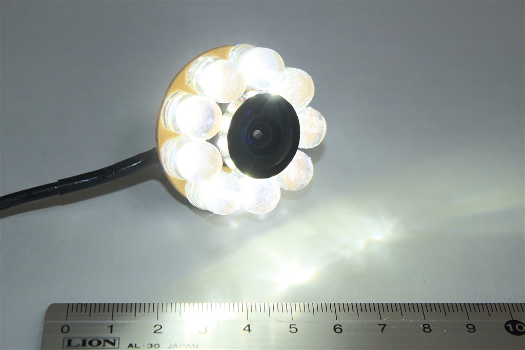 虫の目レンズに付けたLEDリング照明(明るさは落として撮影)