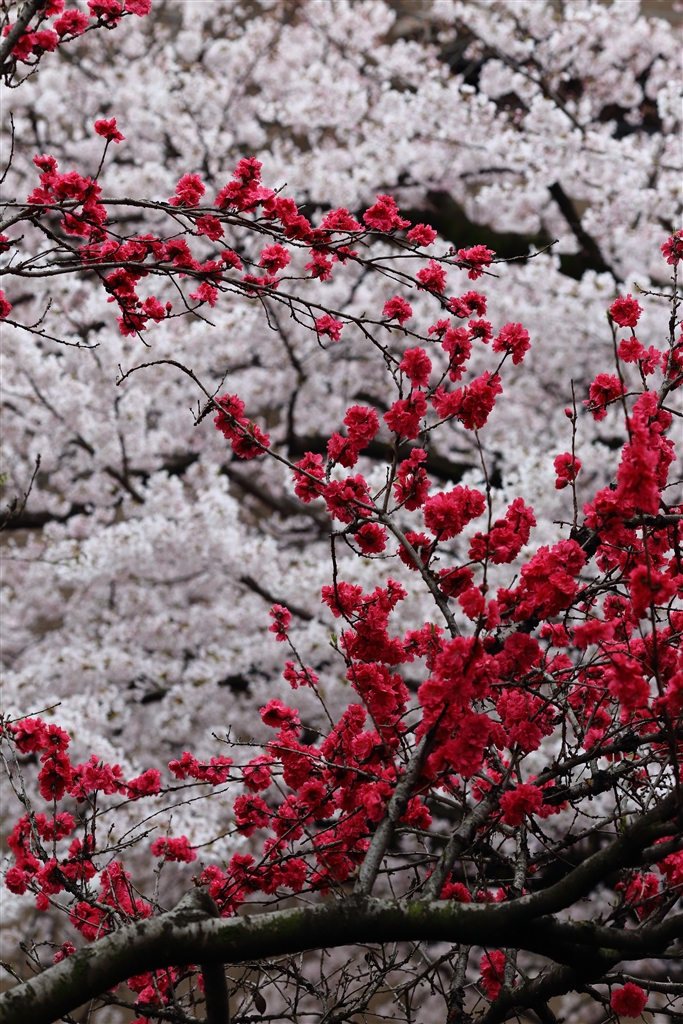 前がハナモモ、後ろがソメイヨシノ。
