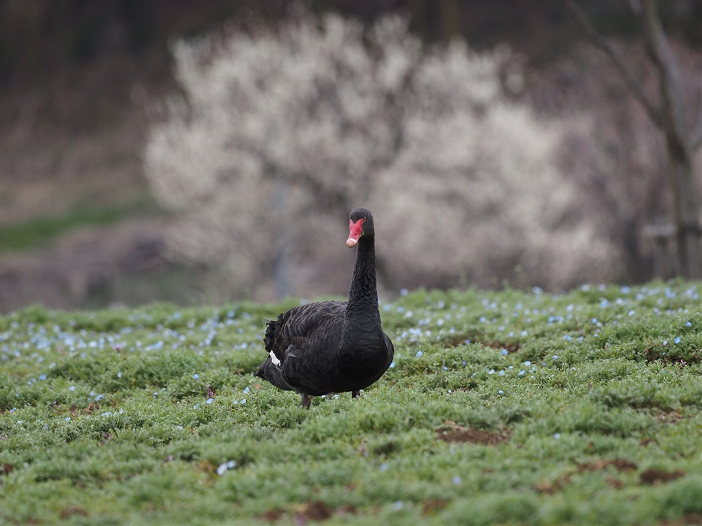 ネモフィラが咲き始めた野原でサラダをお食事の黒鳥