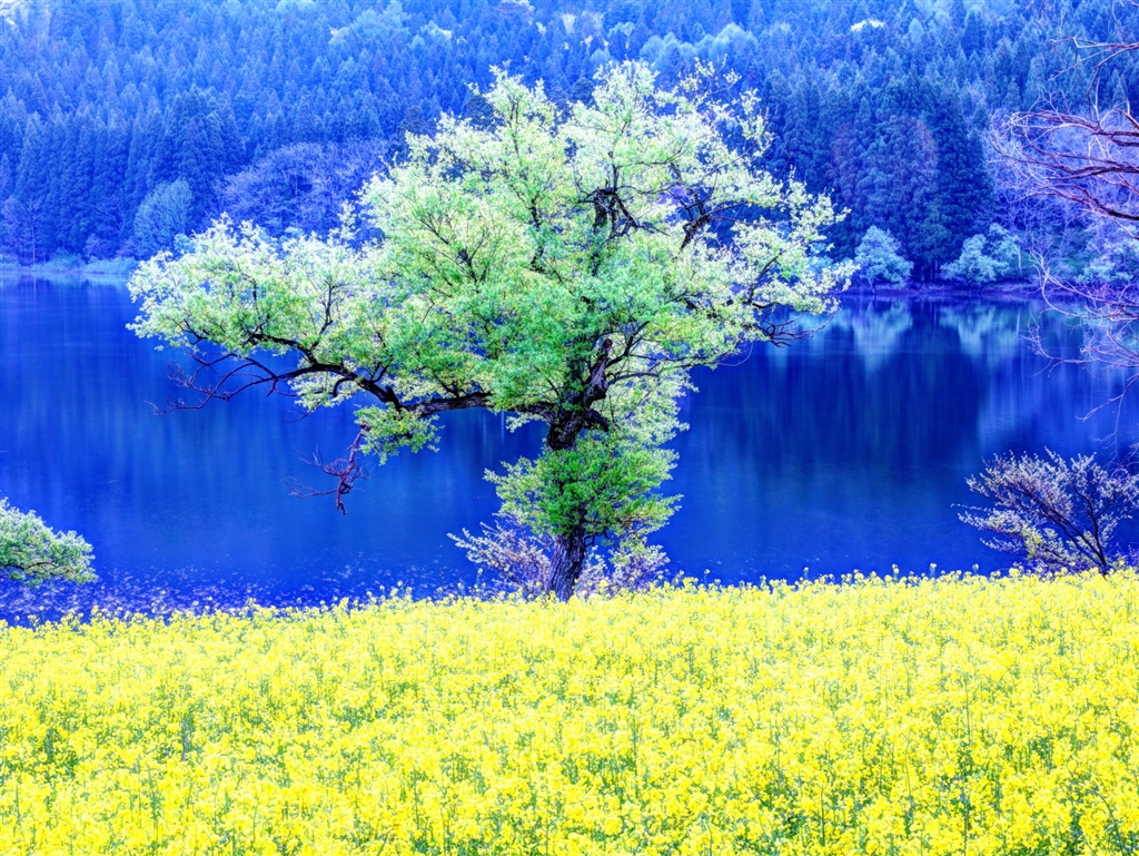 北竜湖畔の菜の花と、おそらく柳の新緑