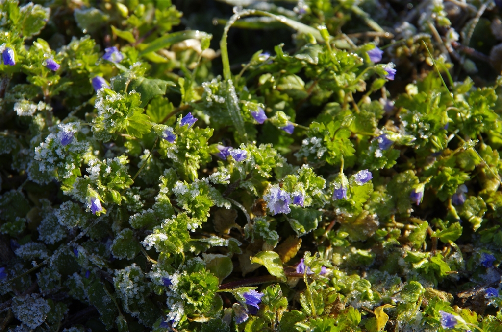 畦の小花には霜の輝きがキラリ