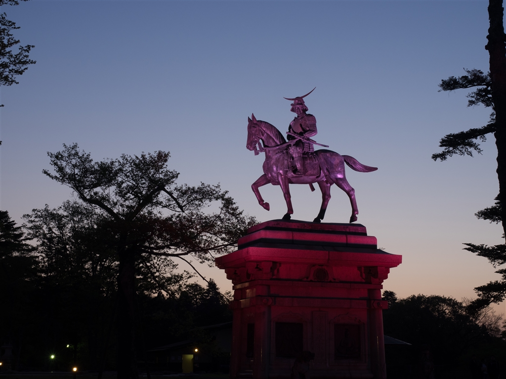 夕方から元気が出て、ご存知正宗公。定番の構図ですが、昨日はライトアップでした。