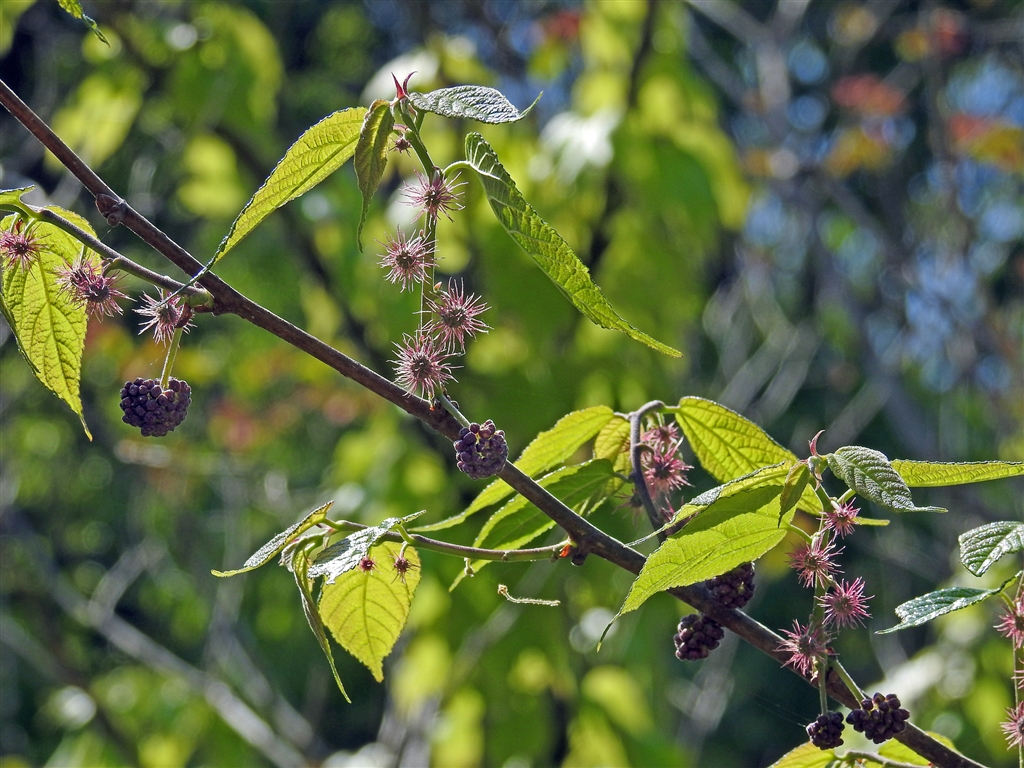 コウゾ 樹皮はミツマタと並ぶ和紙原料。髭の生えた赤花が雌花で粒々の花が雄花。