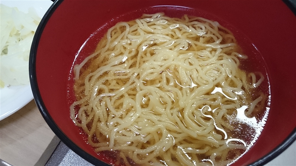 熱湯を注いだ液体スープに、茹であげた麺を投入します。