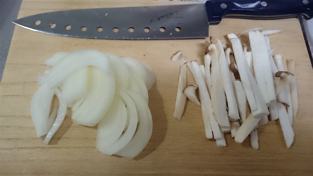 玉葱、ニラを包丁で切ります。