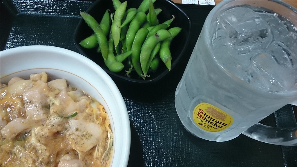 なか卯さんの親子丼に枝豆を付けて、プハ〜ッ。