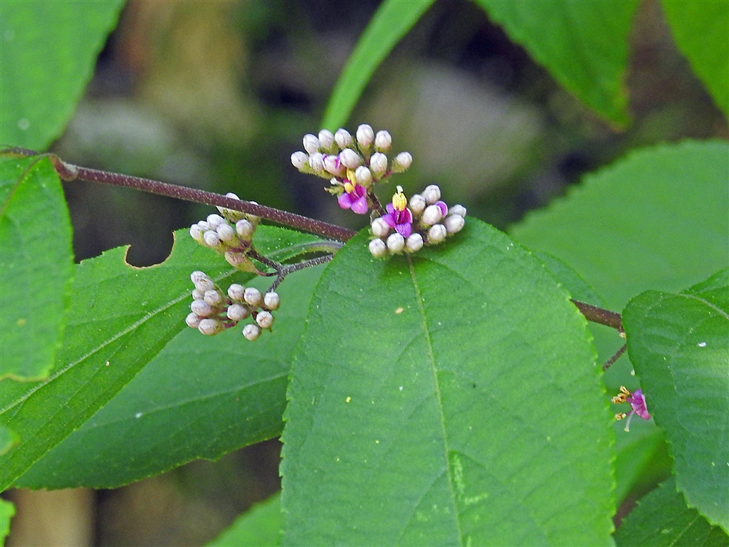 ムラサキシキブの蕾と花 葉全周が鋸葉なので紫式部。秋に丸い小さな紫の実が愉しみ