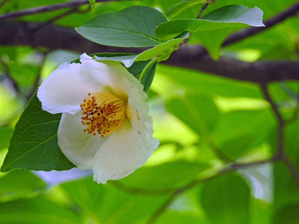 ヒメシャラ 白い5枚の花弁の縁にこまかいギザギザがあり幹は樹皮が斑に剥れツルツル