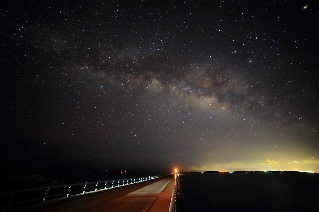 池間大橋の手すりの上に三脚を載せて、おっかなびっくりの撮影